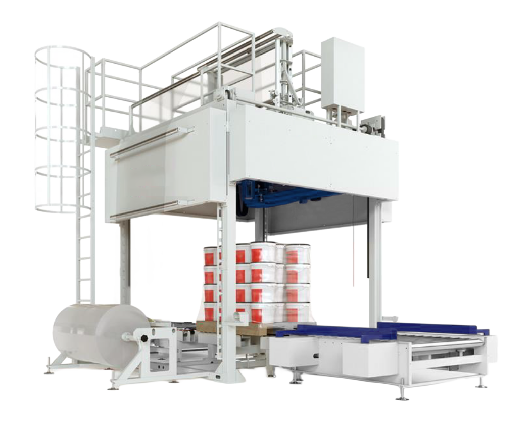 A stretch hood machine applies tubular stretch film around a pallet with goods.