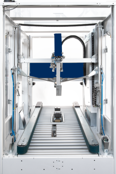 Les boîtes remplies proviennent généralement d’un convoyeur motorisé avec les rabats inférieurs repliés et les rabats supérieurs ouverts. Les boîtes sont transportées au moyen de convoyeurs latéraux motorisés pour garantir une parfaite fermeture.