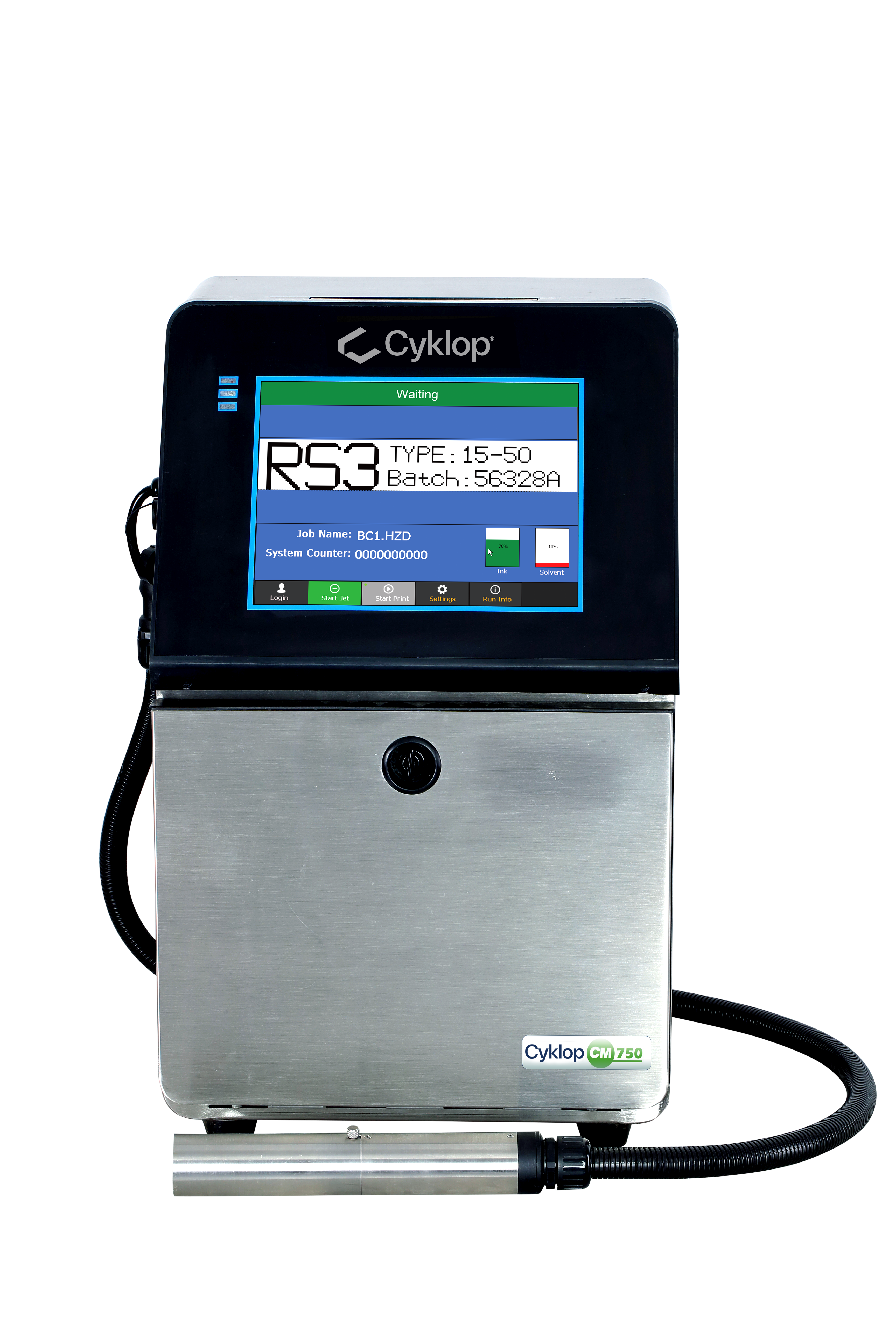 Cyklop menyediakan pencetak jet dakwat berterusan (CIJ) yang direka bentuk untuk memenuhi walaupun keperluan pelabelan industri yang paling mencabar. Pencetak berprestasi tinggi ini menampilkan antara muka skrin sentuh intuitif, menjadikannya mudah untuk mencetak kod bar, maklumat alamat, tarikh terbaik sebelum dan tanda kritikal lain secara langsung pada produk pukal, kotak dan palet.